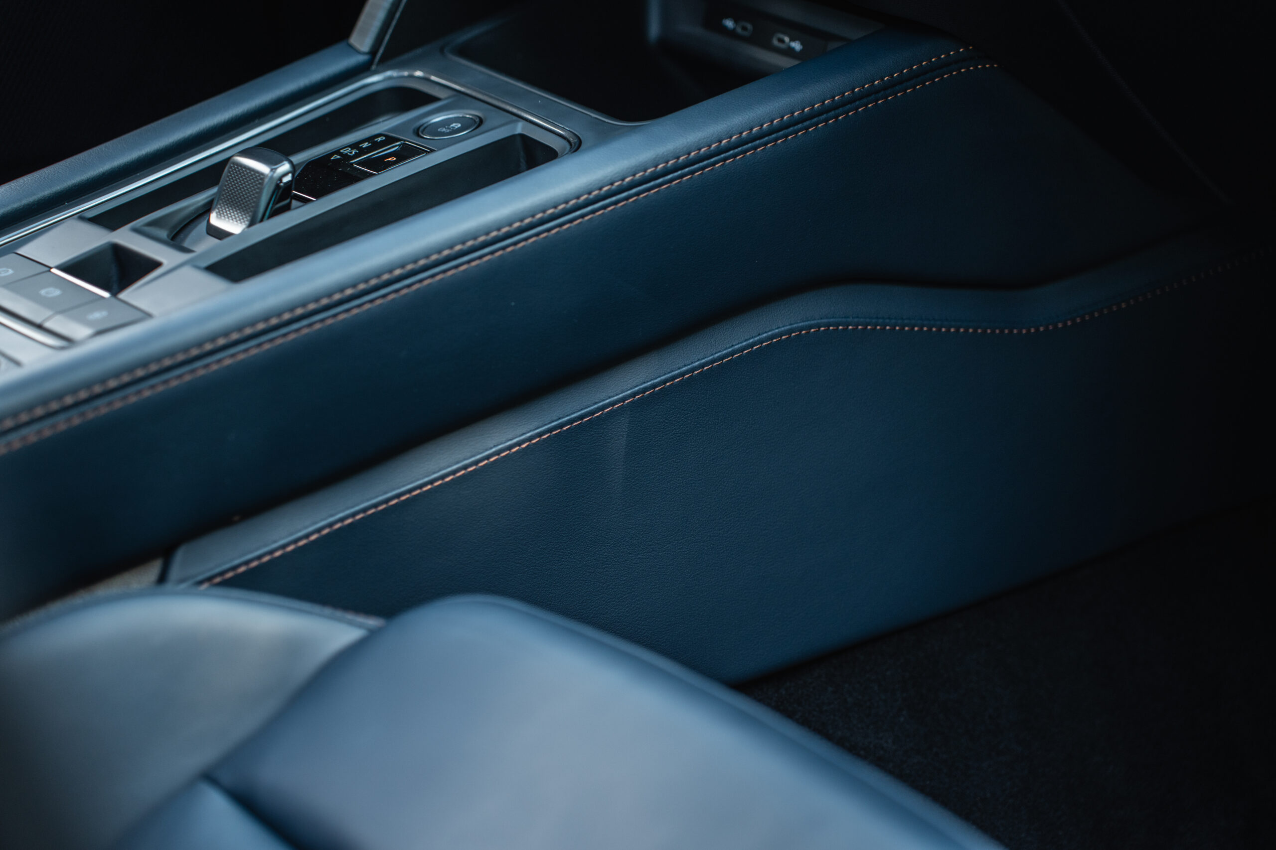Gotowe, obszyte, dolne osłony tunelu środkowego dedykowane do aut CUPRA Formentor oraz CUPRA Leon (2020-26) w kolorze PETROL BLUE.